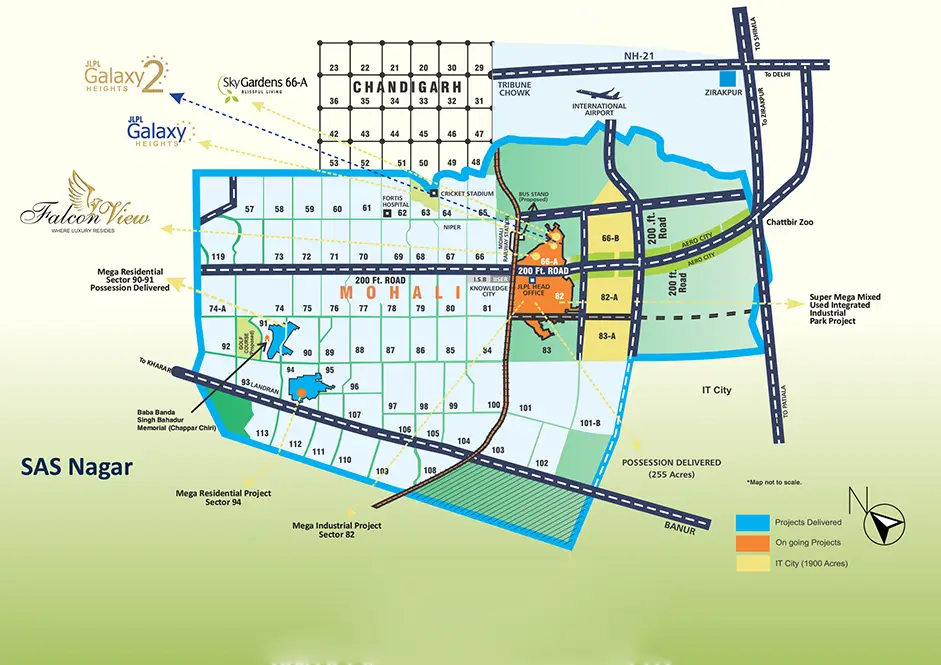 JLPL Falcon View is located in Sector 66A, Sahibzada Ajit Singh Nagar, Mohali, Punjab. It offers easy access to Airport Road, Chandigarh International Airport, ISB Mohali, Plaksha University, Fortis and Mayo Hospitals, Mohali Railway Station, and shopping malls such as Elante and VR Punjab.